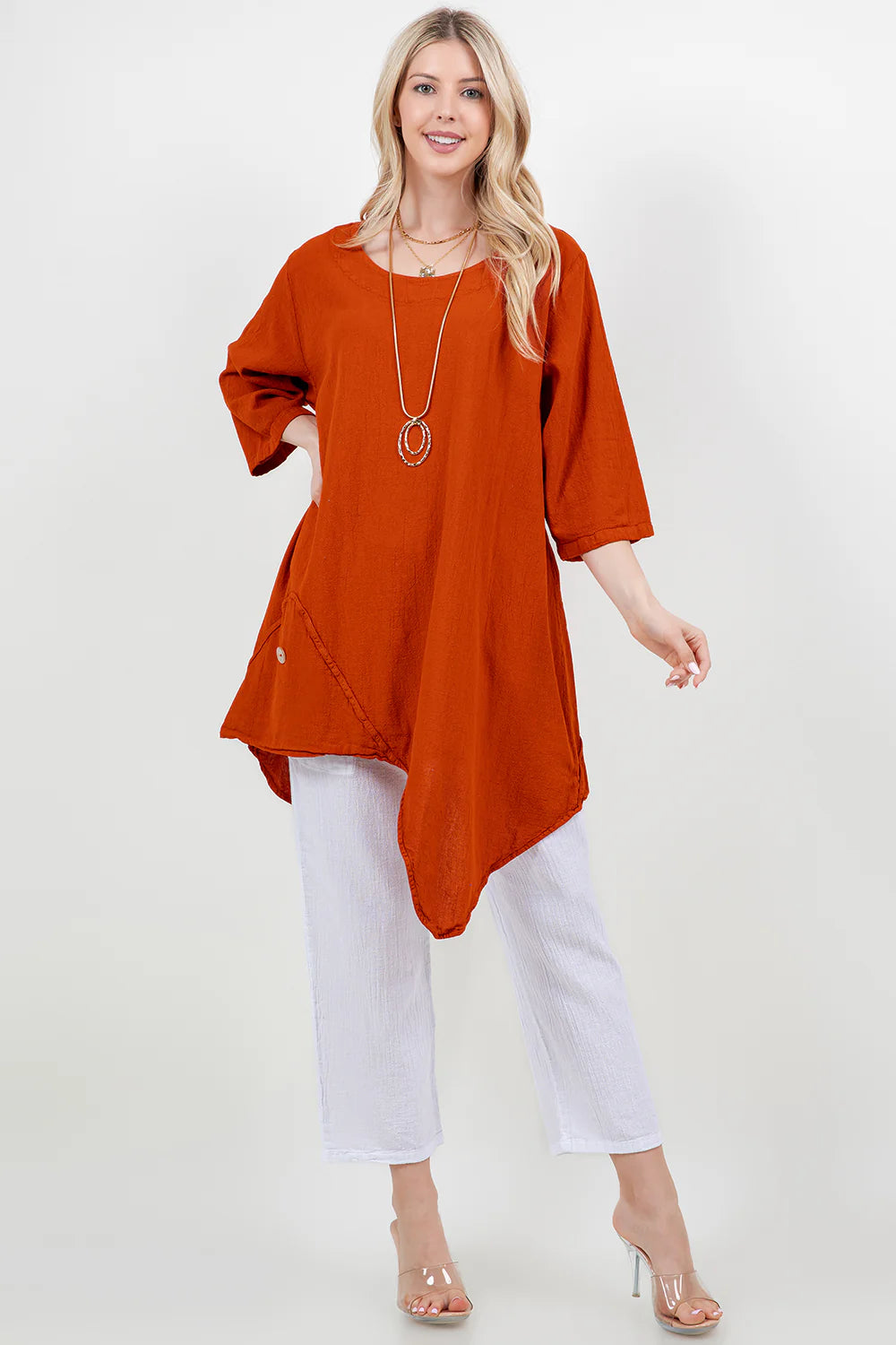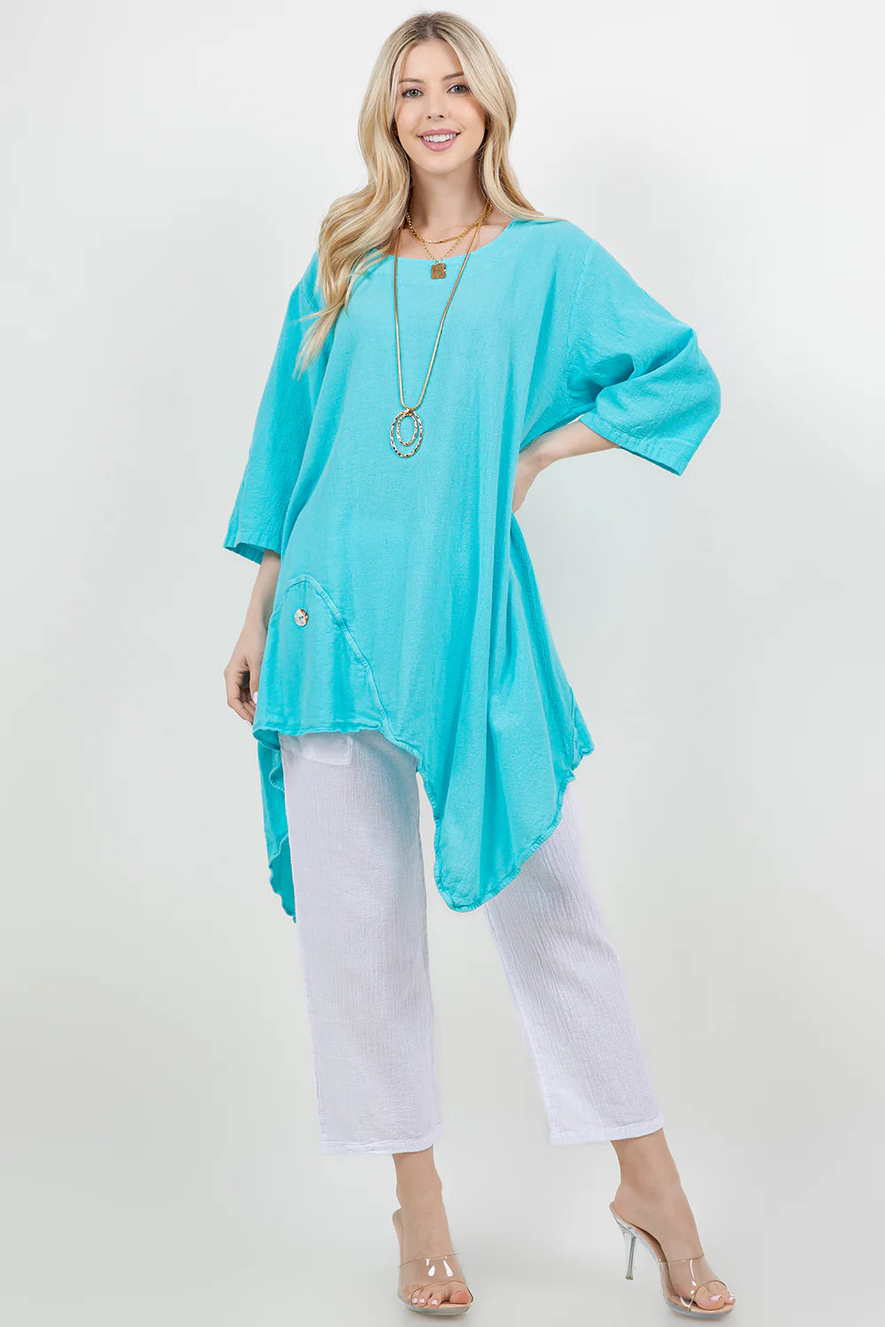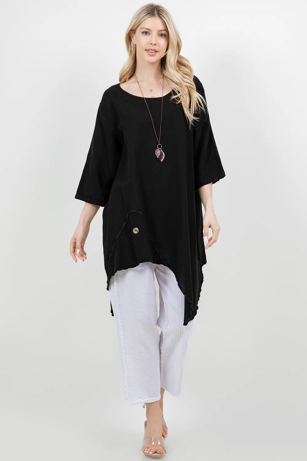 A scoop neck tunic featuring 3/4 sleeves and an asymmetrical bottom cut is flattering and comfortable for all! A side button accent adds flair to the shirt design.