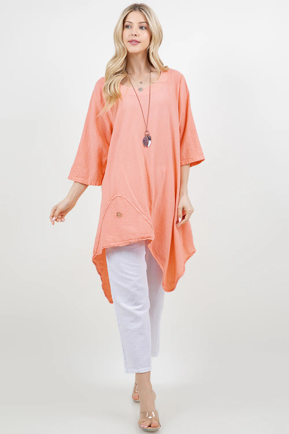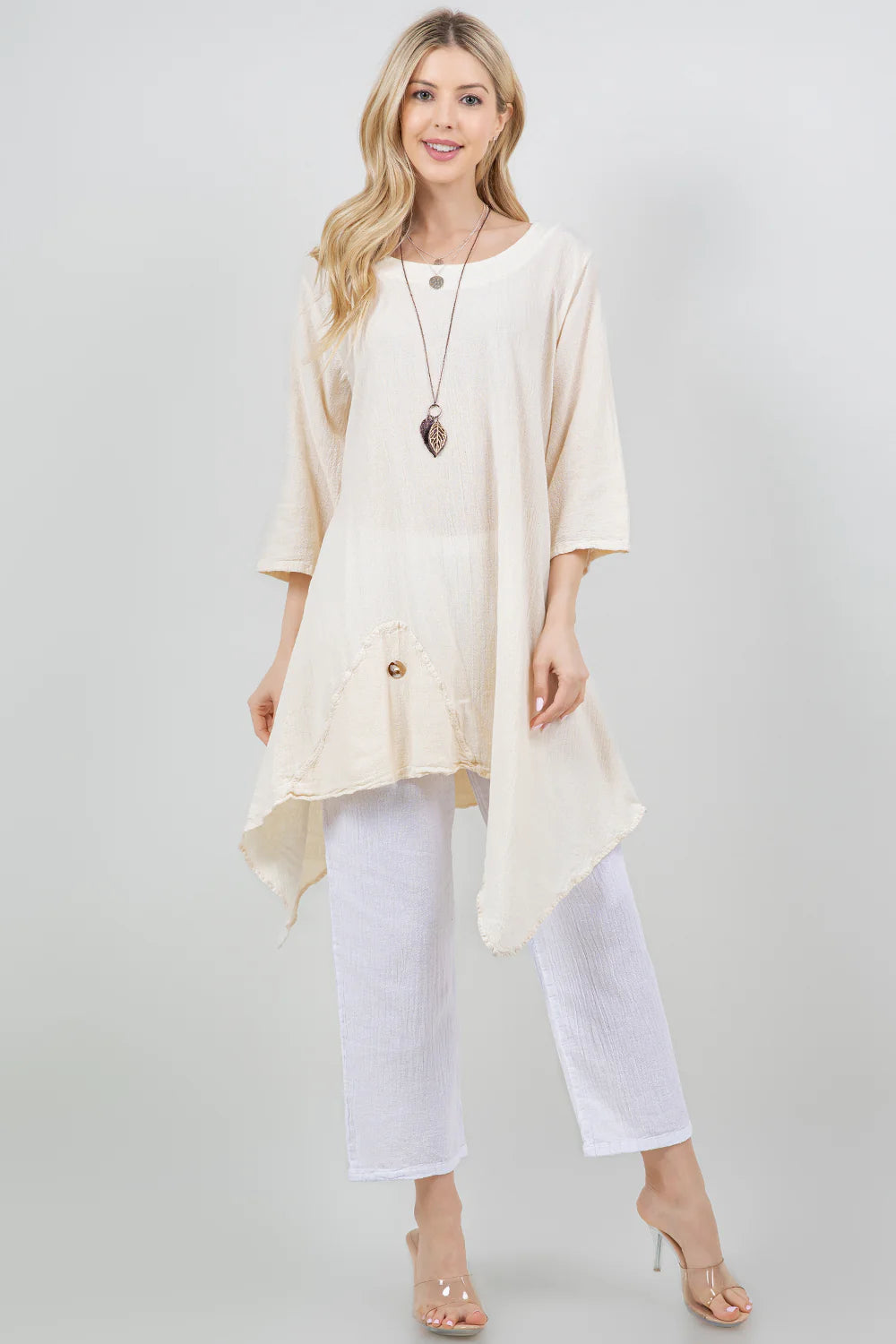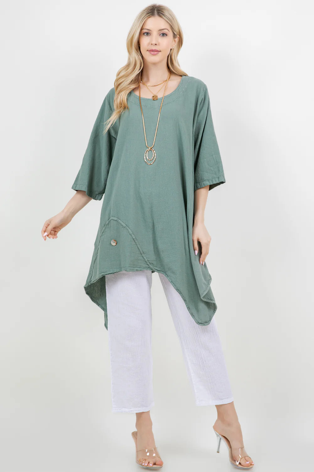 A scoop neck tunic featuring 3/4 sleeves and an asymmetrical bottom cut is flattering and comfortable for all! A side button accent adds flair to the shirt design.
