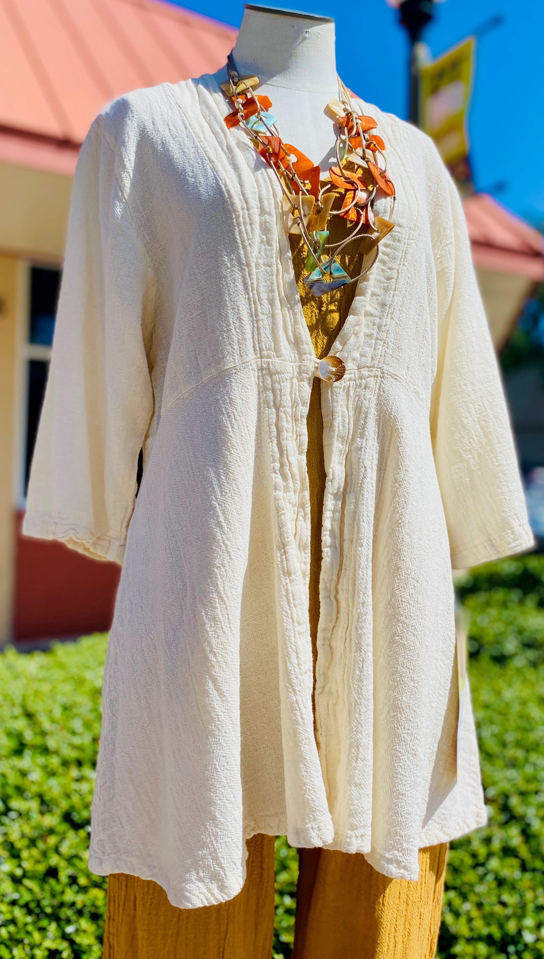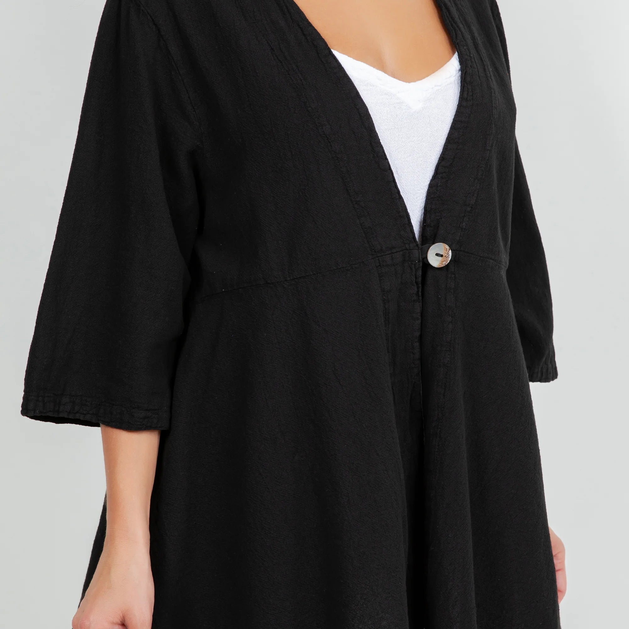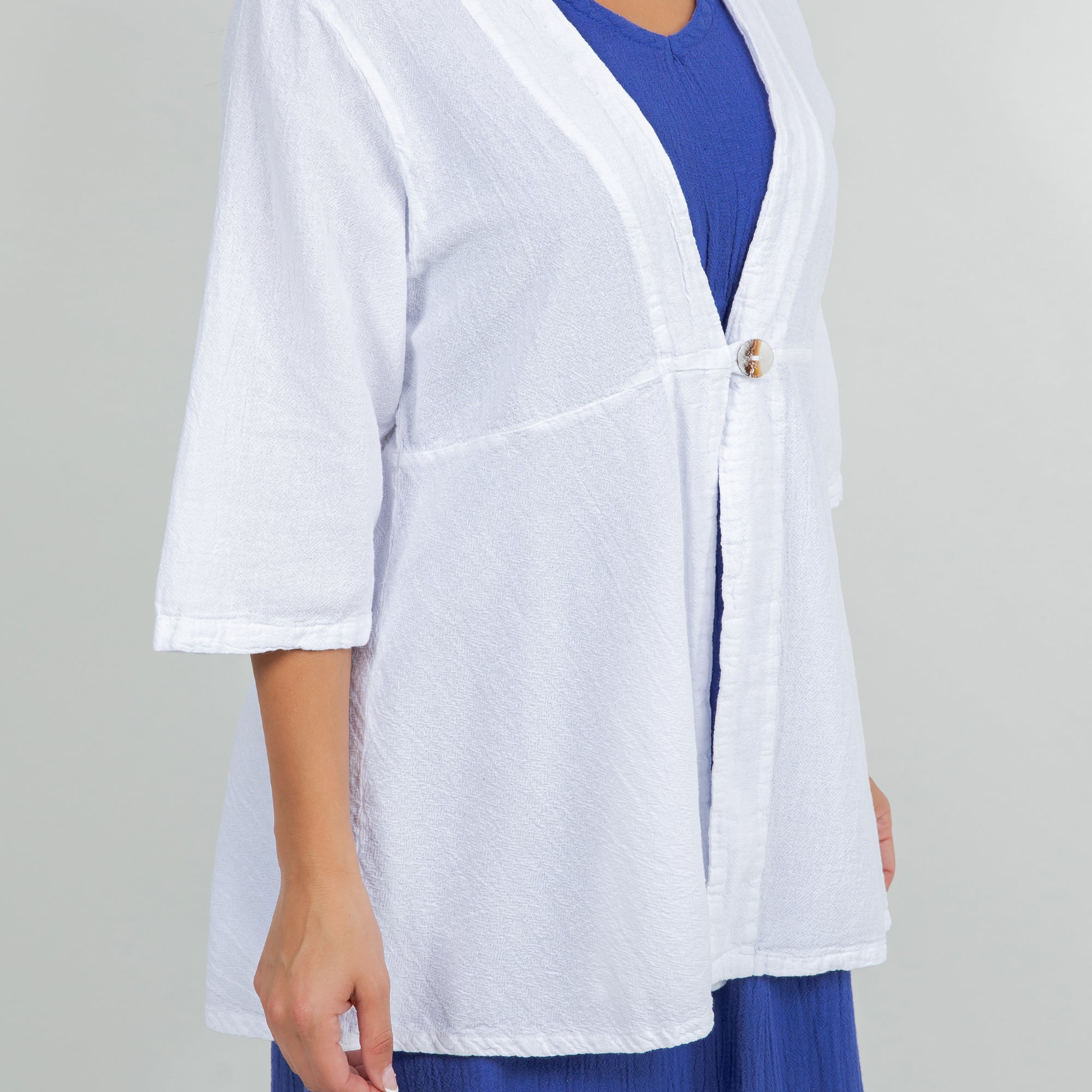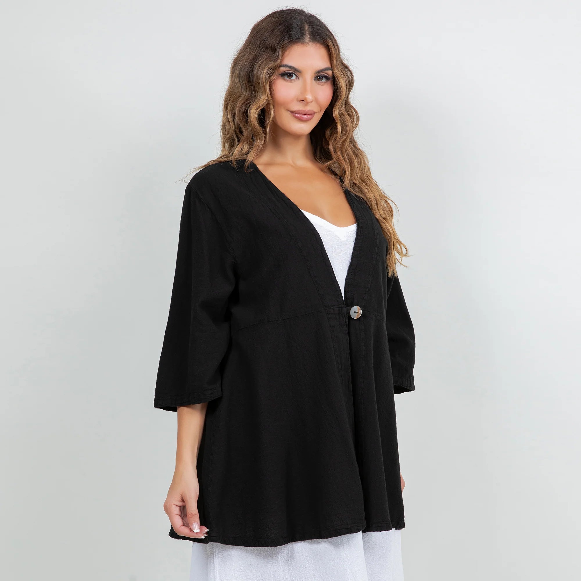 The Chinatown is a 3/4 sleeve, single button enclosure style jacket that is flattering for all!