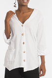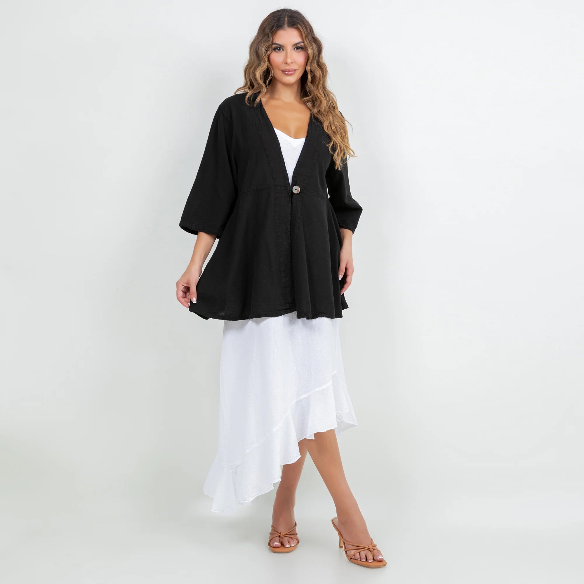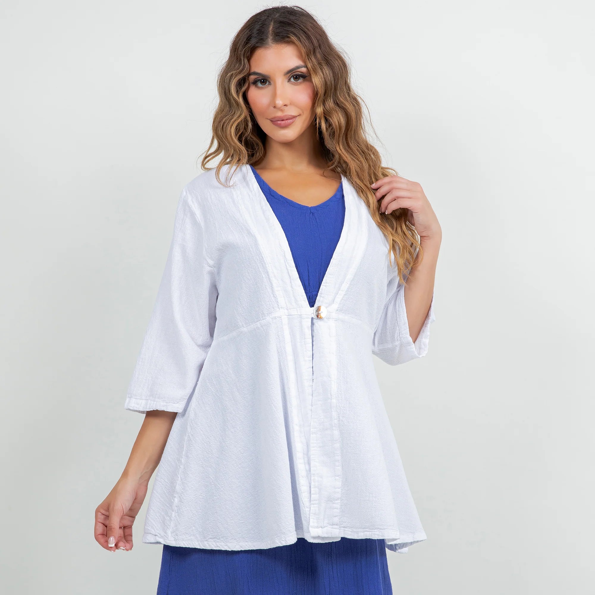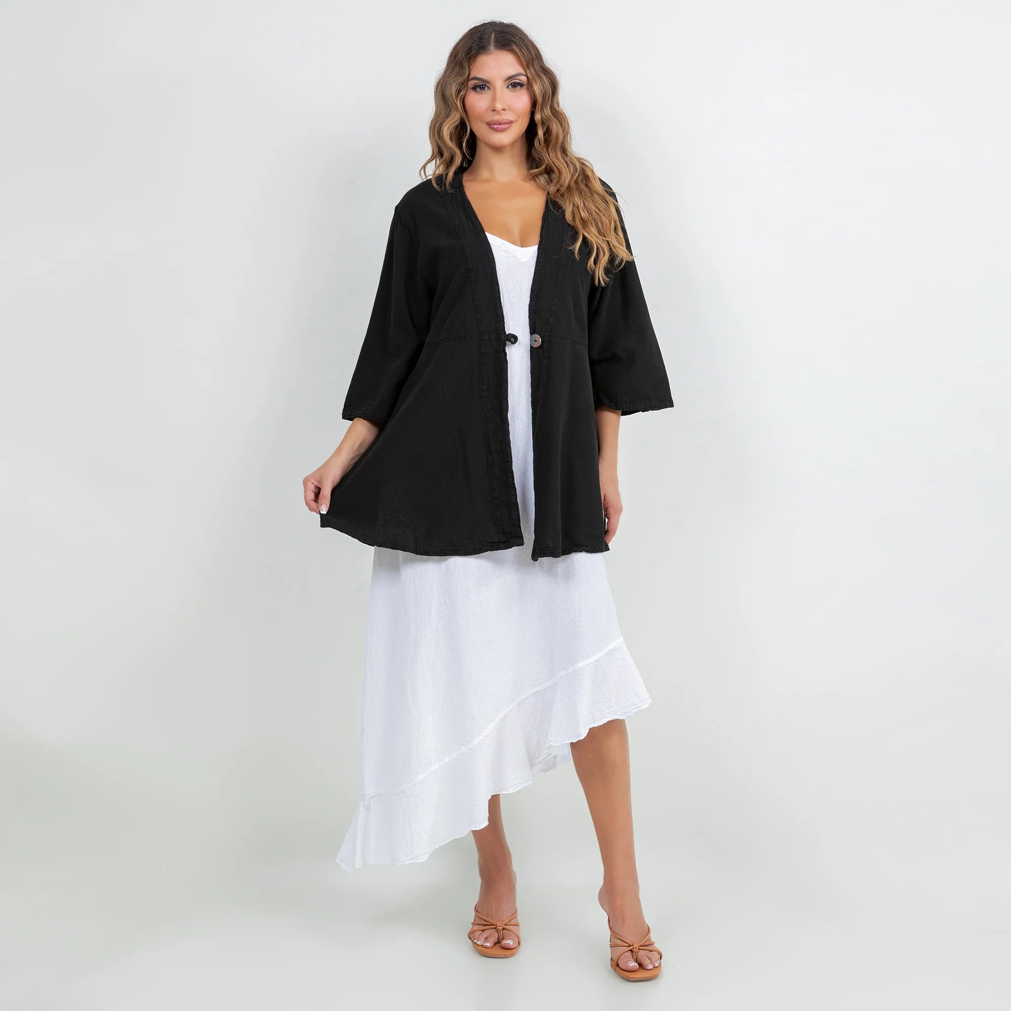 The Chinatown is a 3/4 sleeve, single button enclosure style jacket that is flattering for all!