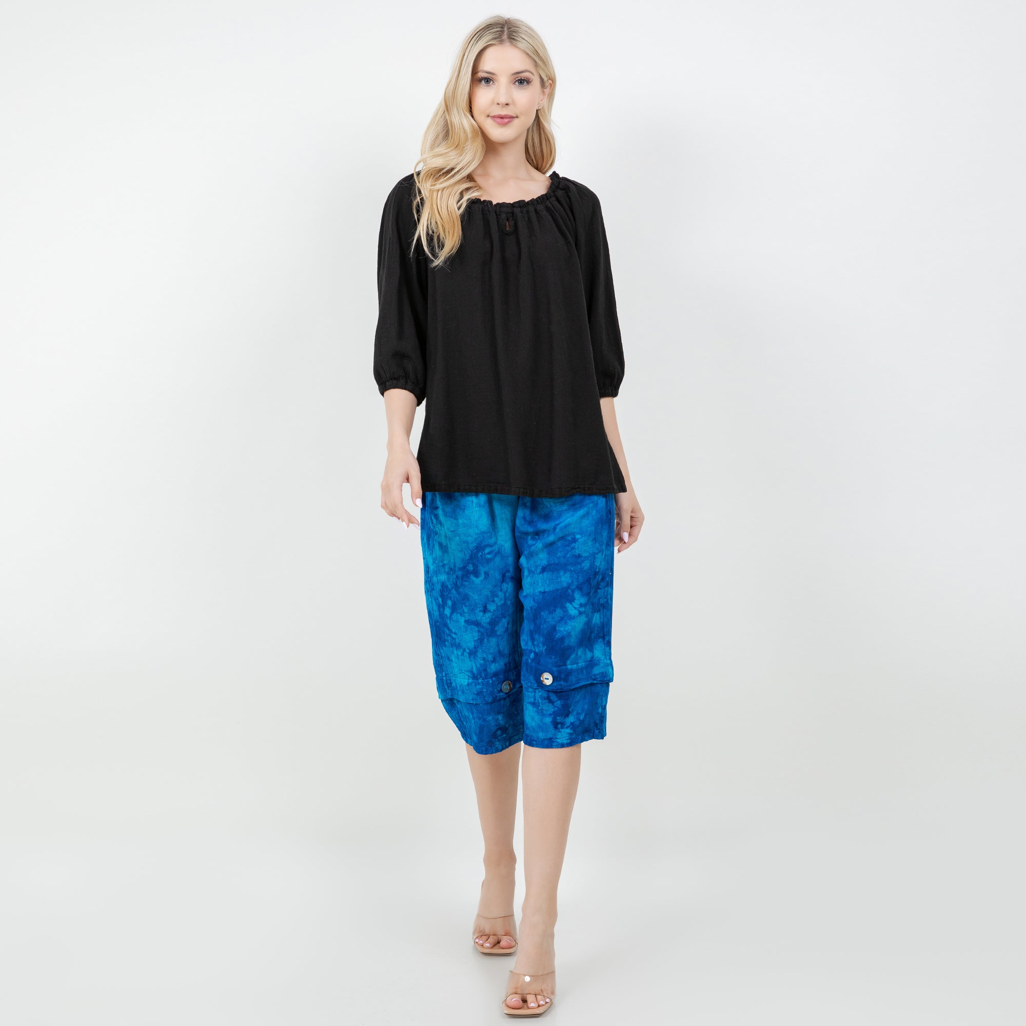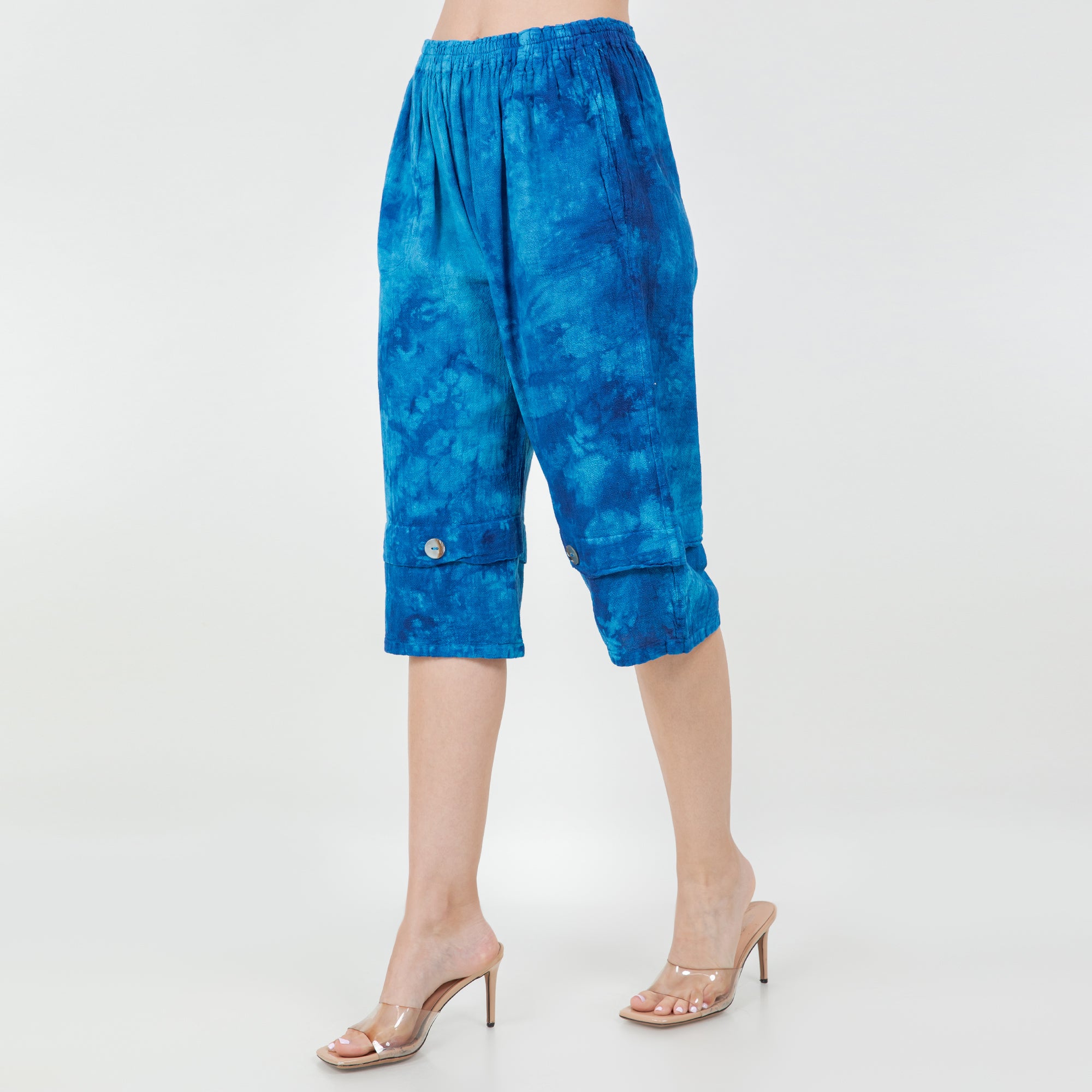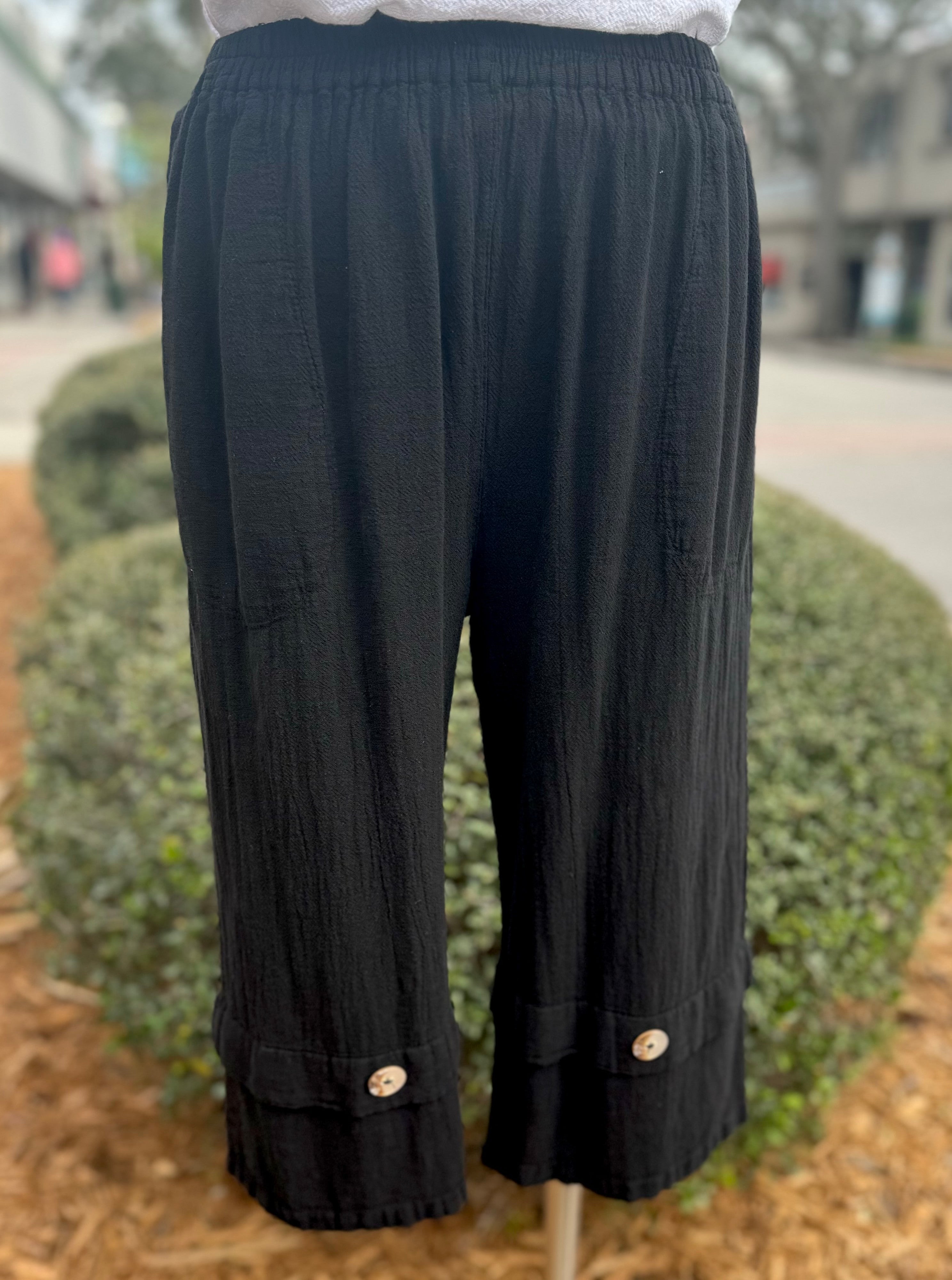 Pocketed elastic waistband capri pant with shell button detail on the front of each leg.
